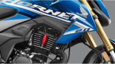 ABS - Anti-lock braking system, Dual-petal disc brakes: On both ends of the bike, Engine stop switch, Hazard switch, Mono-shock rear suspension, Sealed chain, Slipper Clutch, Tank extensions, Upside-down forks: Gold-colored and segment-first